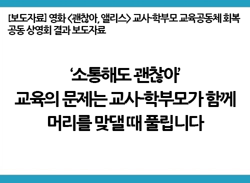 꽉 막힌 교육 문제는 결코 교사들의 노력으로만 해결될 수 없고, 또한 학부모의 노력만으로도 해결될 수 없습니다. 결국 교사-학부모가 함께 머리를 맞대고 대화할 때 해결될 수 있습니다. 이번 <괜찮아, 앨리스> 공동 상영회를 통해 교사는 왜 학생들에게 괜찮다고 말하지 못하고 죄책감에 빠지는지, 학부모는 왜 자녀들에게 괜찮다고 말하지 못해서 고통에 시달리는지, 서로 이해할 수 있는 시간이었습니다. 결국 학생을, 자녀를 향한 마음은 교사나 학부모나 똑같다는 것을, 영화를 보며 공감했습니다. 이 마음이 서로 확인되고 대화로 이어질 때 교육 문제는 한 올 한 올 풀리리라 확신합니다.